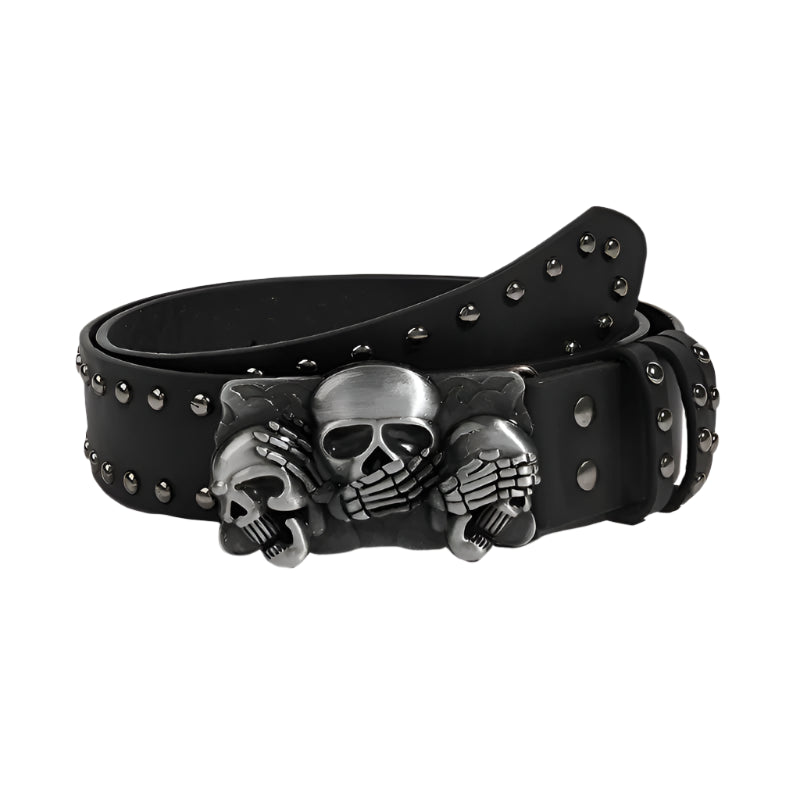 Gotikinis diržas su kaukolėmis ir smeigėmis - sagtis su "see no evil" motyvu