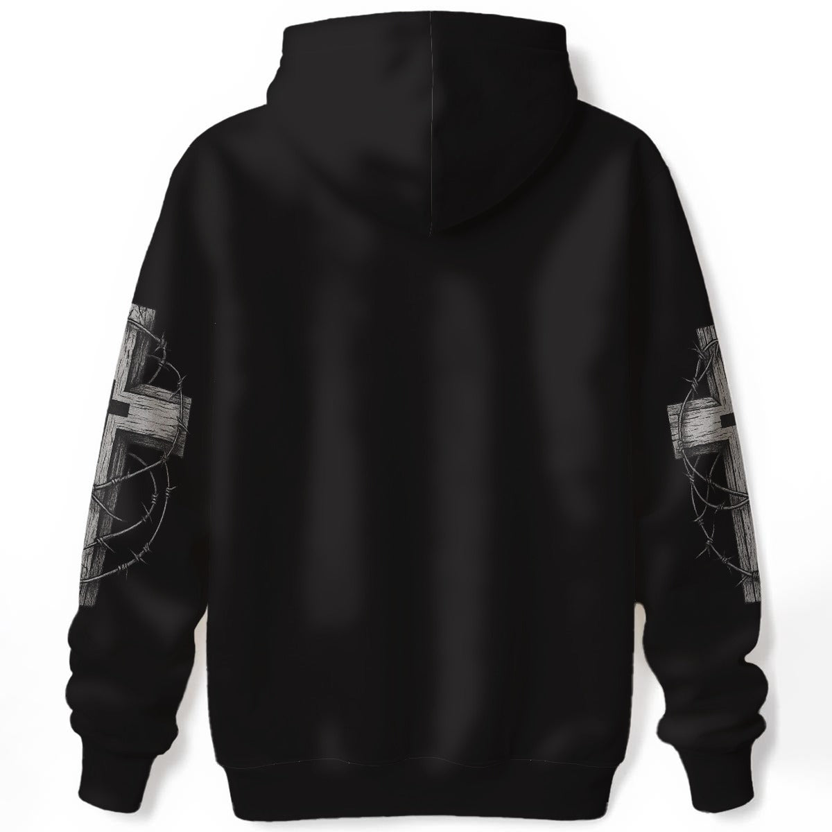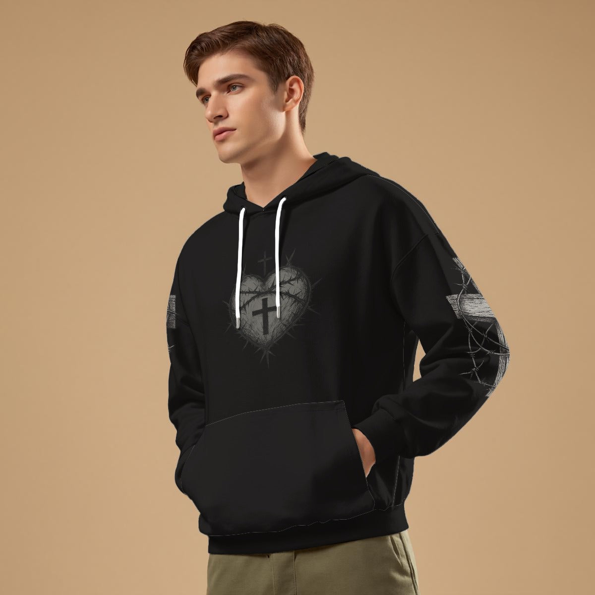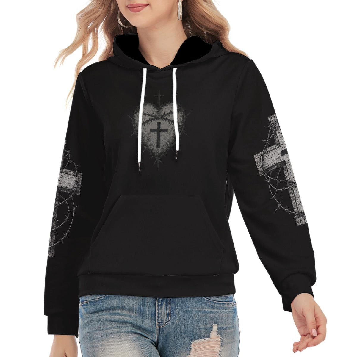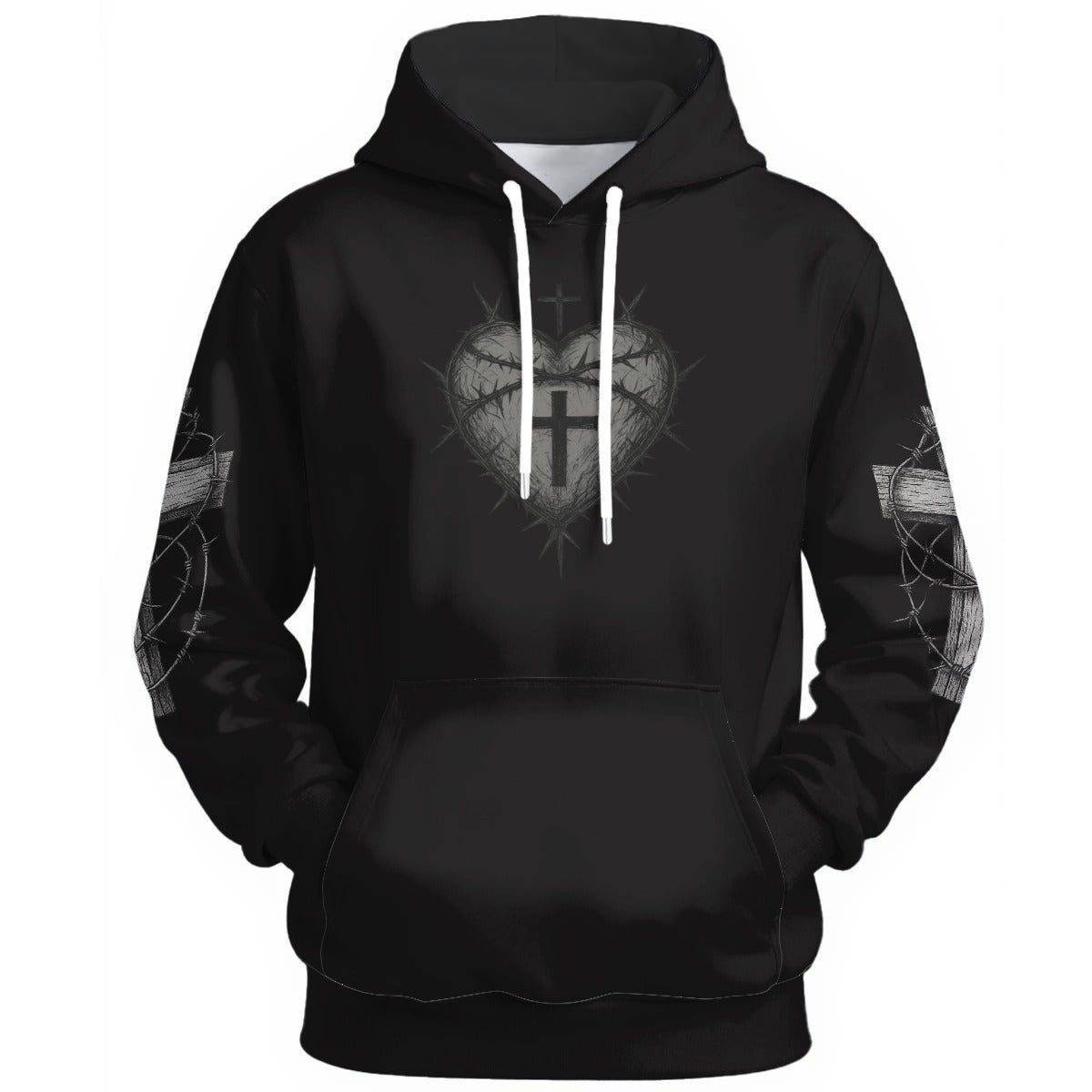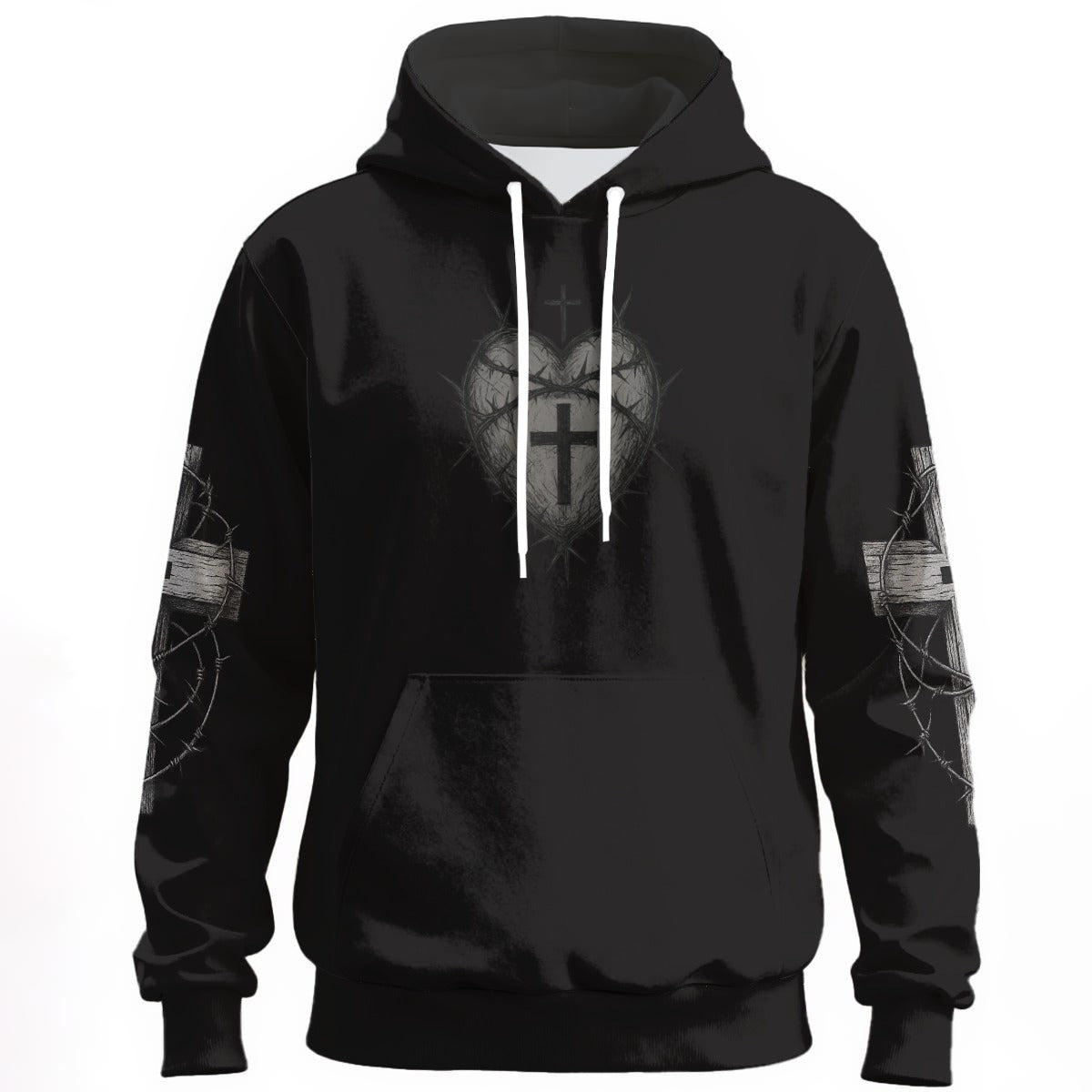 Gotikinis džemperis su širdimi ir kryžiumi, apsuptu erškėčių vainiku, juodas