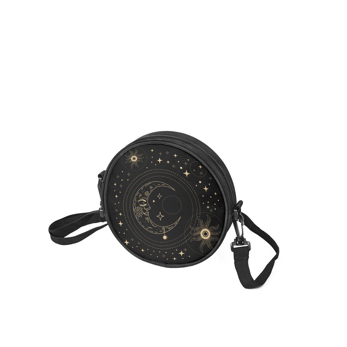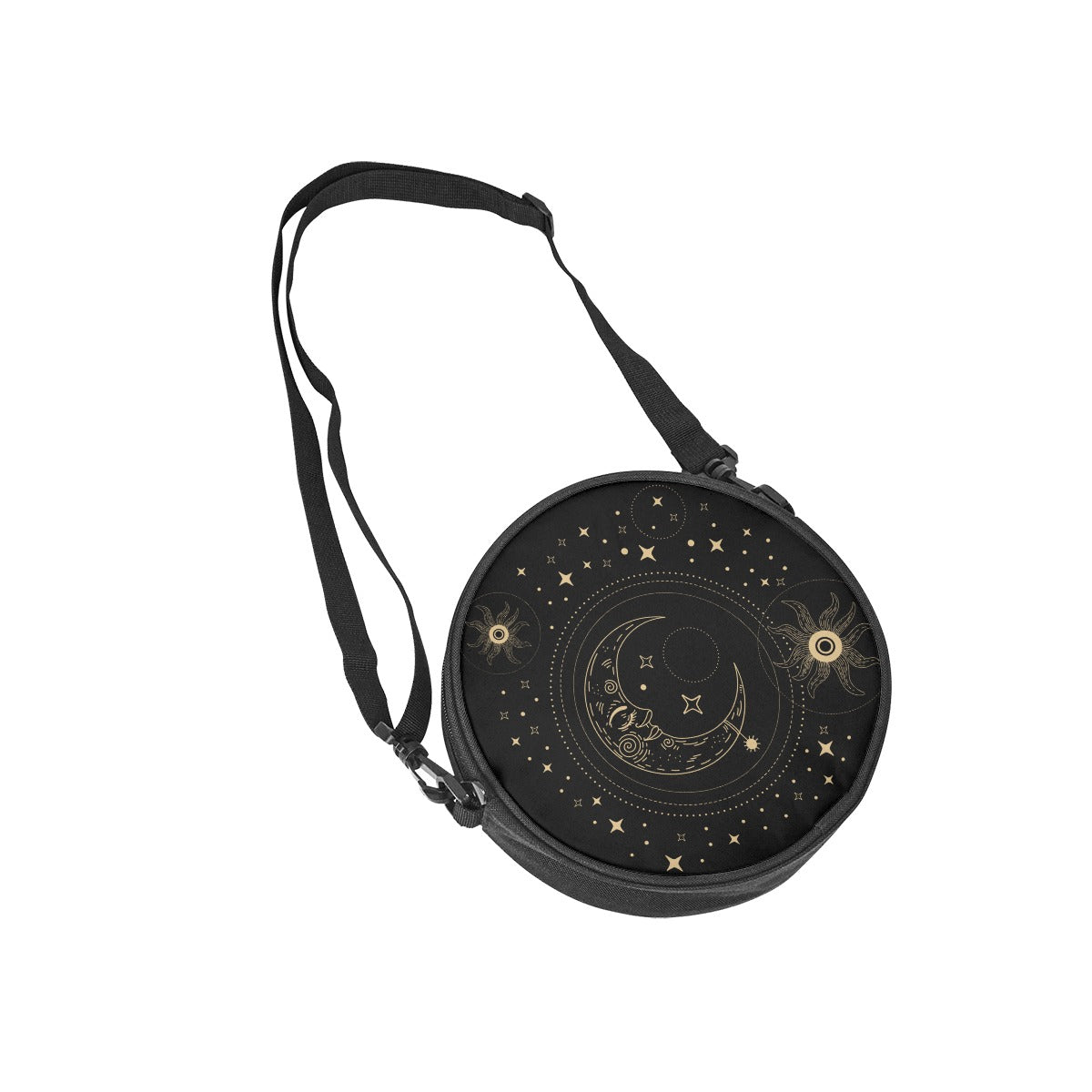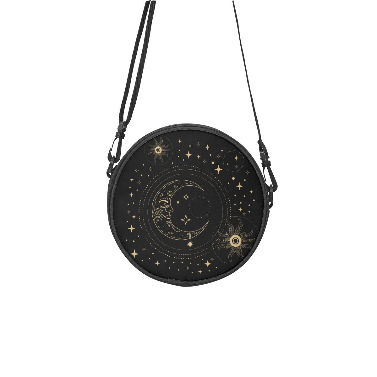 Juoda apvali rankinė su mėnulio ir saulės motyvu boho gotikos stiliuje