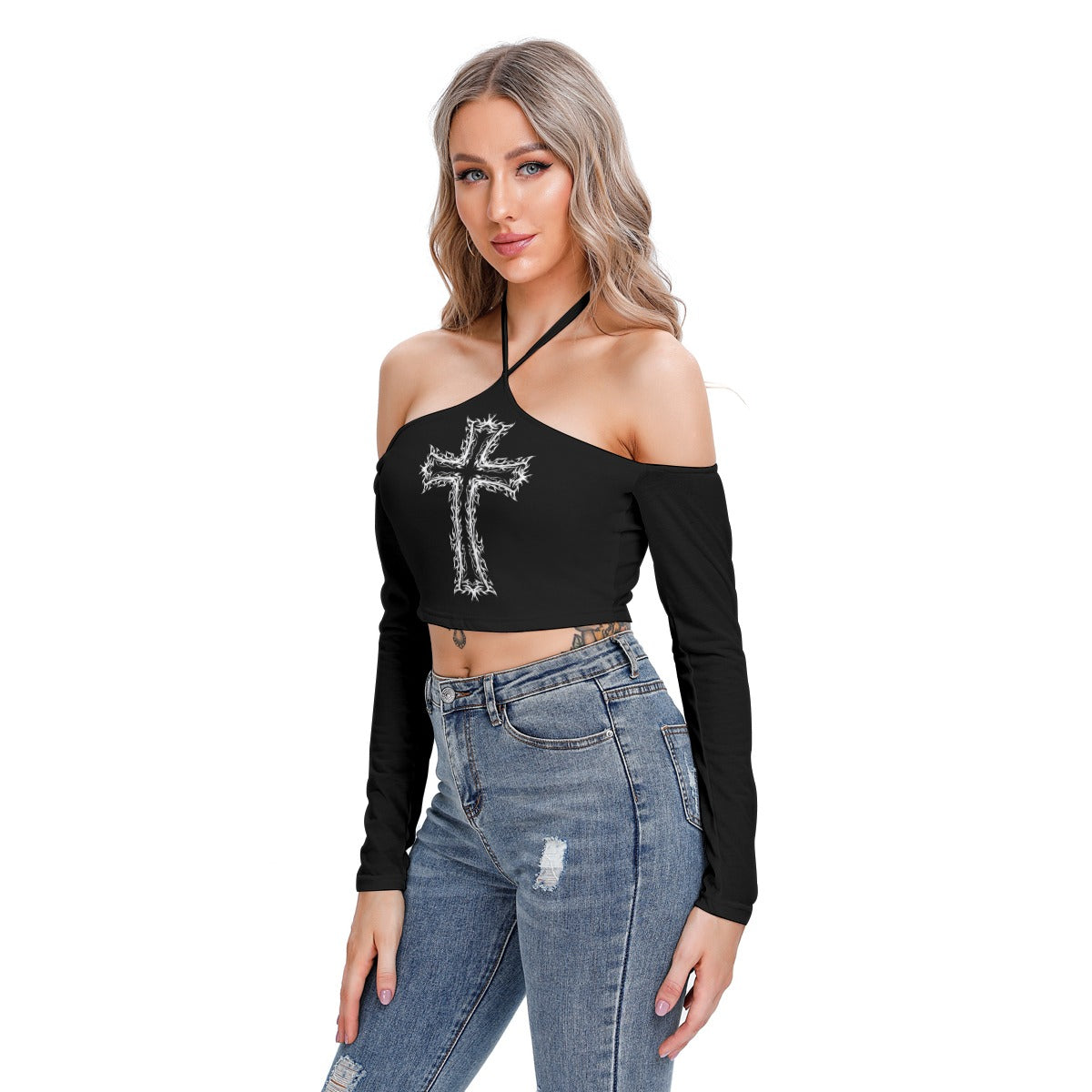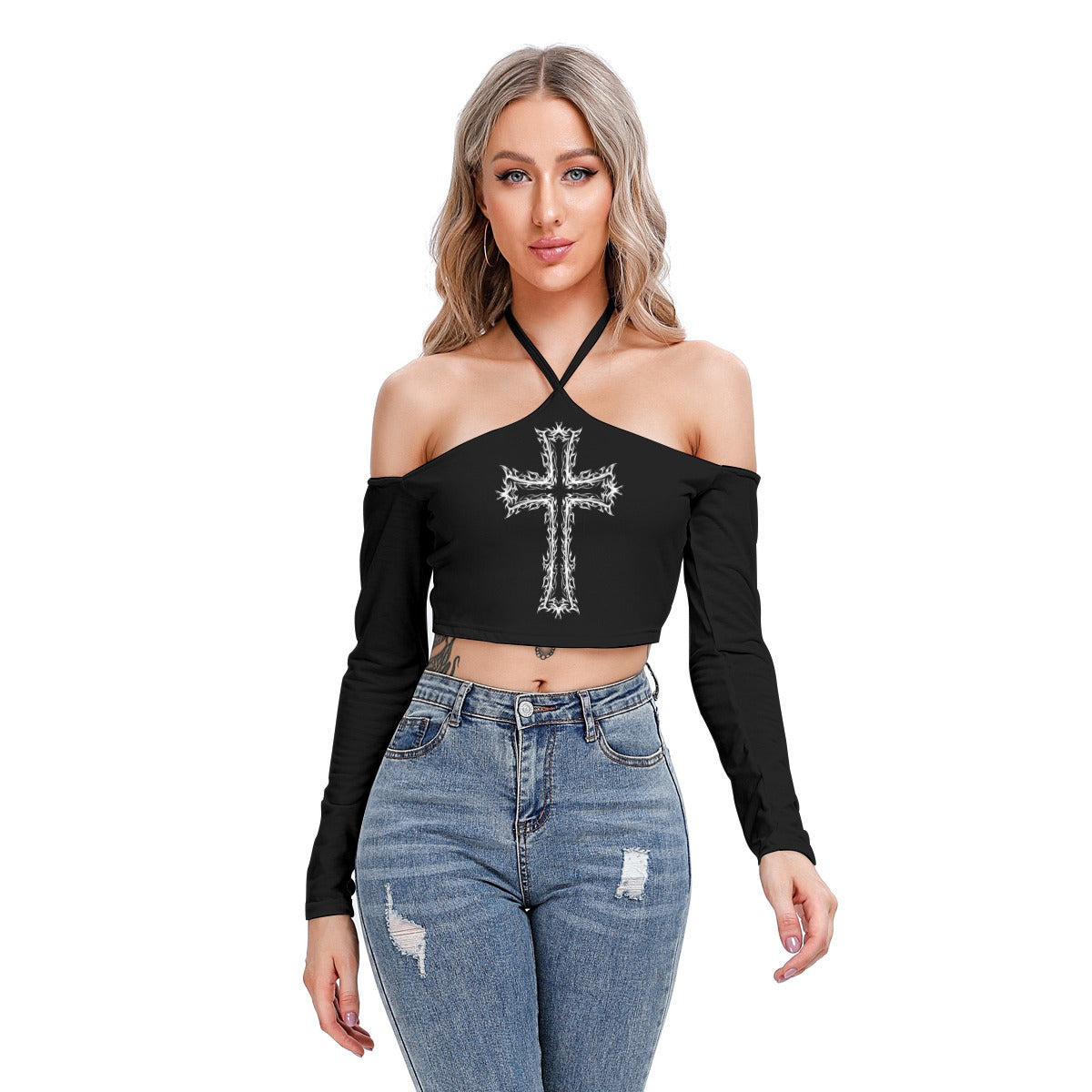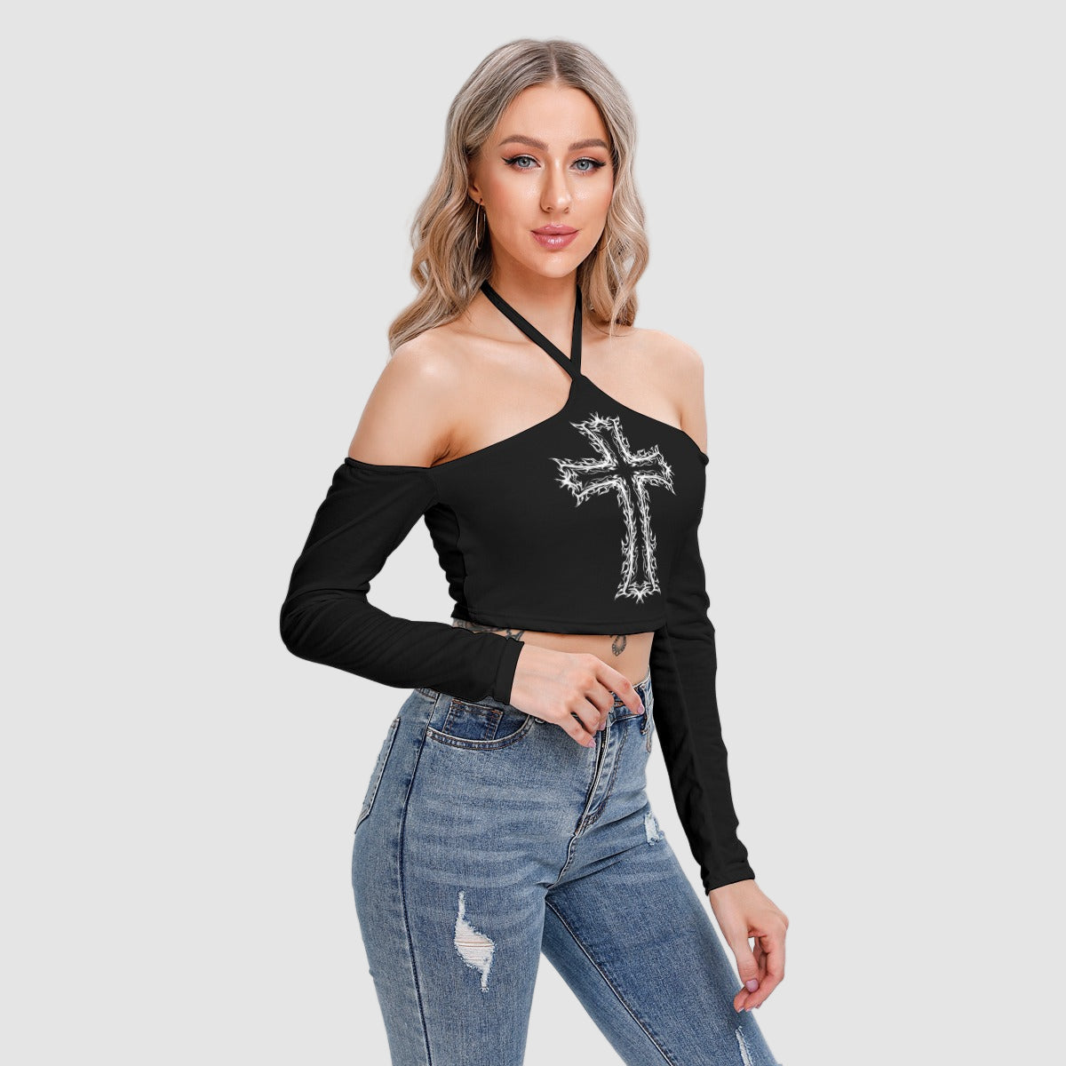 - Ilgos rankovės, surišimas už kaklo, atviri pečiai, priekinė dalis su pamušalu